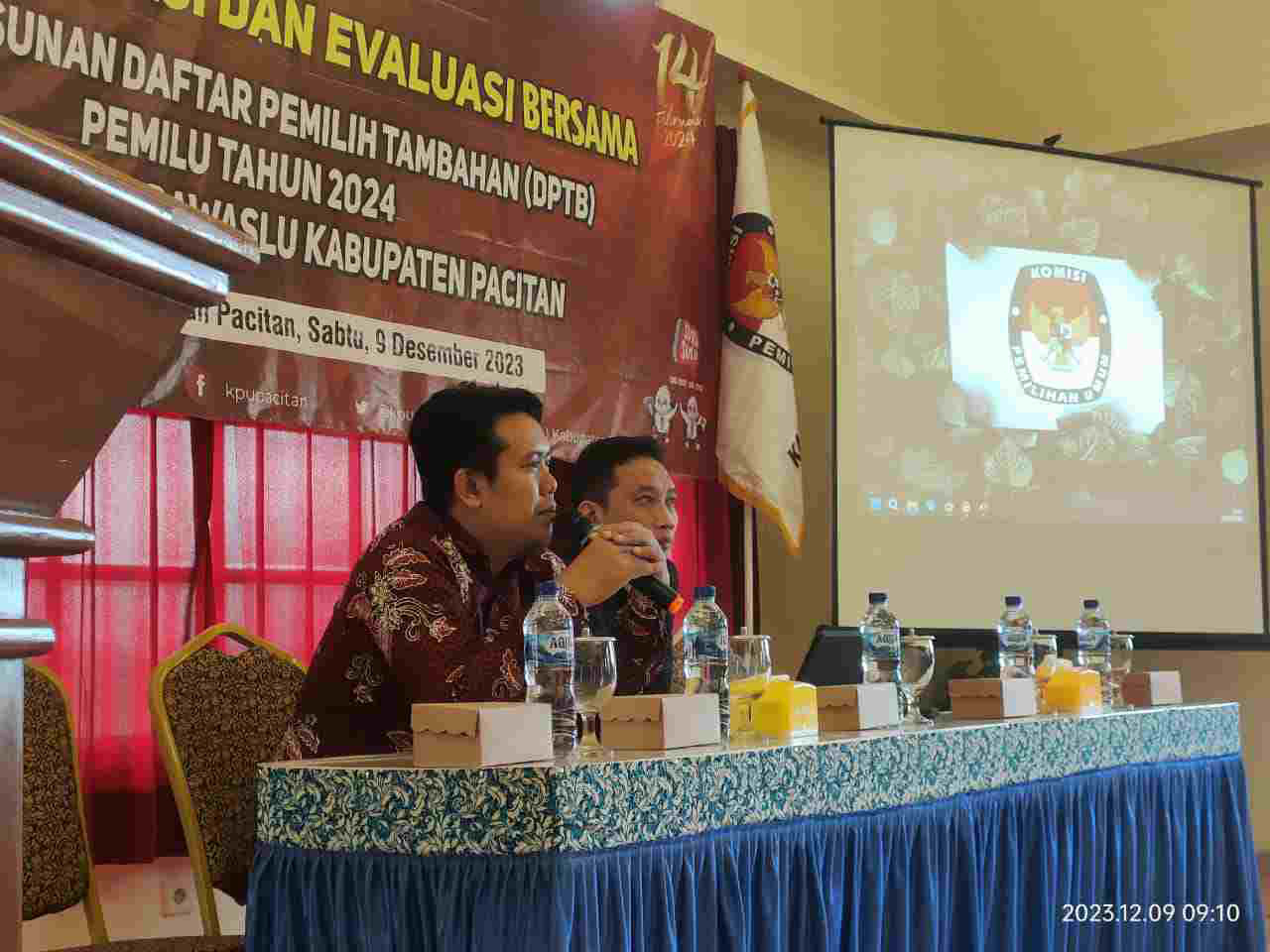 Pada Sabtu (09/12/2023), Komisi Pemilihan Umum (KPU) Kabupaten Pacitan dan Badan Pengawas Pemilu (Bawaslu) Kabupaten Pacitan menyelenggarakan rapat koordinasi dan evaluasi bersama untuk menyusun Daftar Pemilih Tambahan dalam rangka pemilihan umum tahun 2024. Acara yang berlangsung di Hotel Srikandi Pacitan ini bertujuan untuk menyamakan persepsi antara kedua lembaga di tingkat Kabupaten, Kecamatan (Panwascam) dan Desa (PKD) dalam penyusunan Daftar Pemilih Tambahan (DPTb) Pemilu 2024.